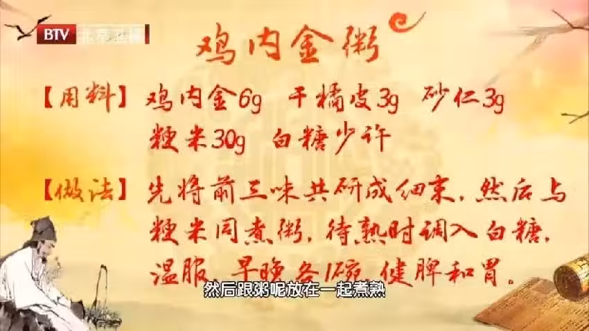 【食材】雞內金6克、干橘皮3克、砂仁3克、粳米30克、白糖少許。