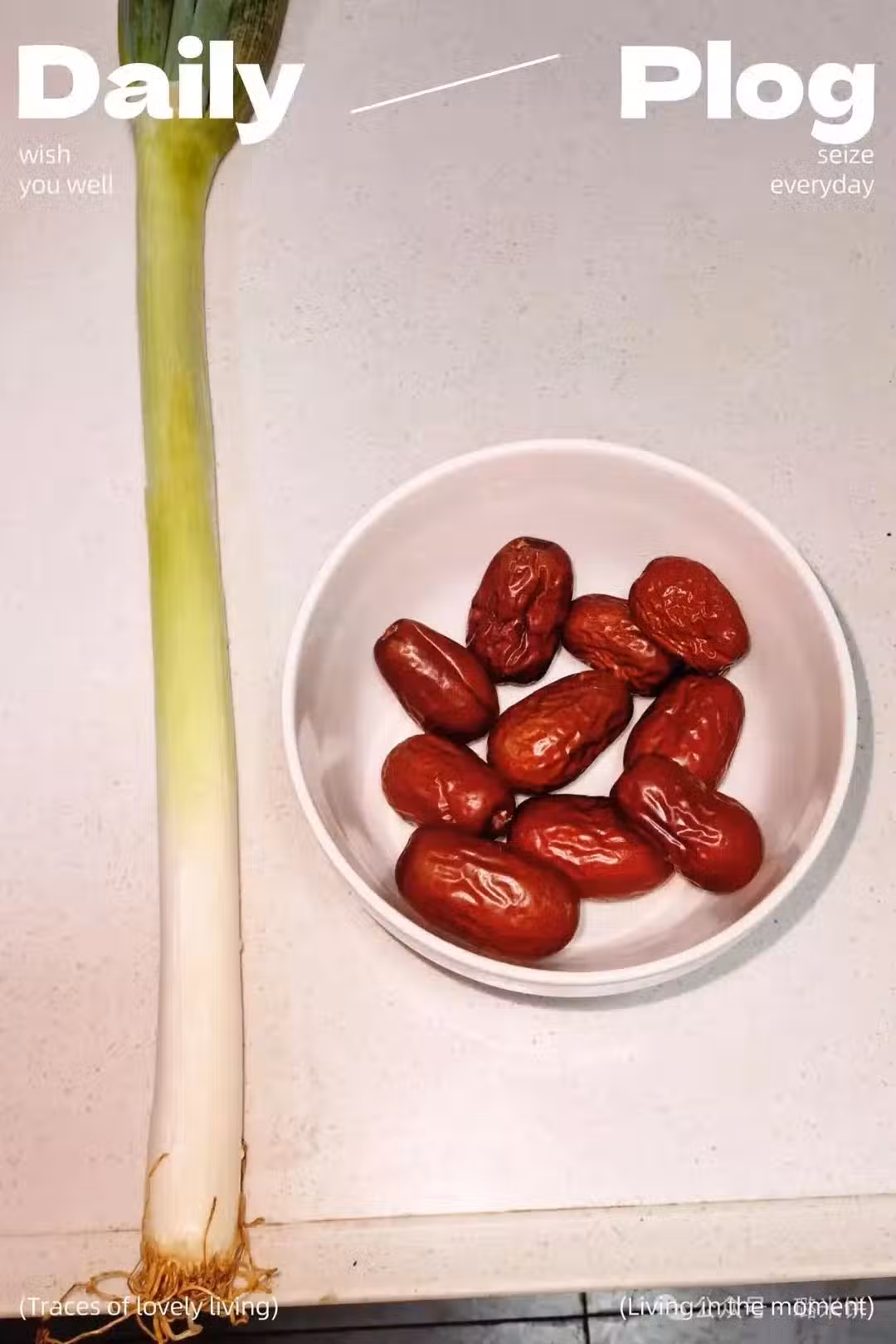 蔥白(帶蔥須)和紅棗一起放入鍋中煮15 - 20分鐘,煮到鍋中只剩小半碗水即可。