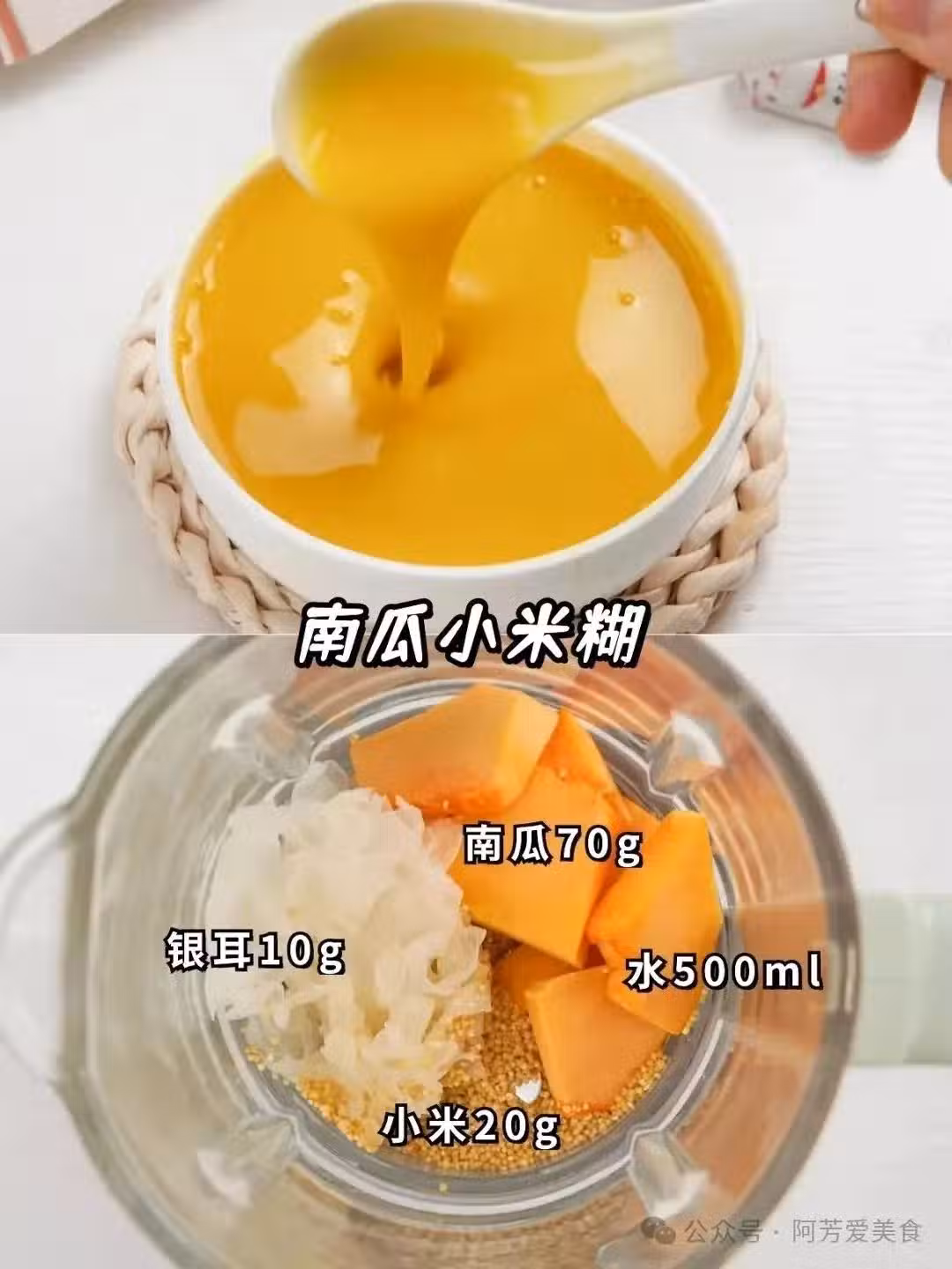 南瓜小米糊,南瓜的糯糯的口感搭配銀耳的口感,很好喝又解膩,喝起來很舒服,喝一口讓人忍不住還想喝。