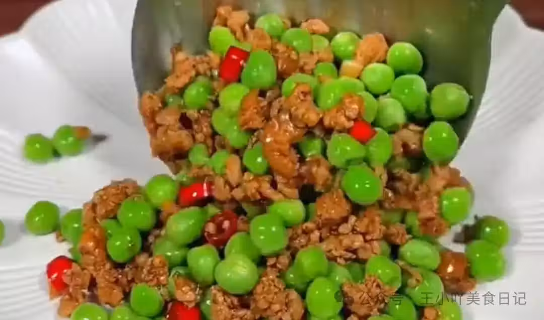 食材清單:新鮮豌豆200克、豬肉末150克、姜蒜適量、小米辣2個、鹽少許、雞精適量、蚝油1勺、生抽1勺、老抽少許、食用油適量。