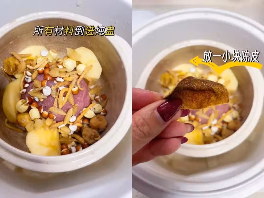 做法:1️⃣ 材料洗凈泡發20分鐘2️⃣ 蘋果去皮去核切塊,瘦肉剁碎3️⃣ 所有食材加陳皮、薑片和1000ml水,隔水燉2小時4️⃣ 最後根據口味加鹽調味。