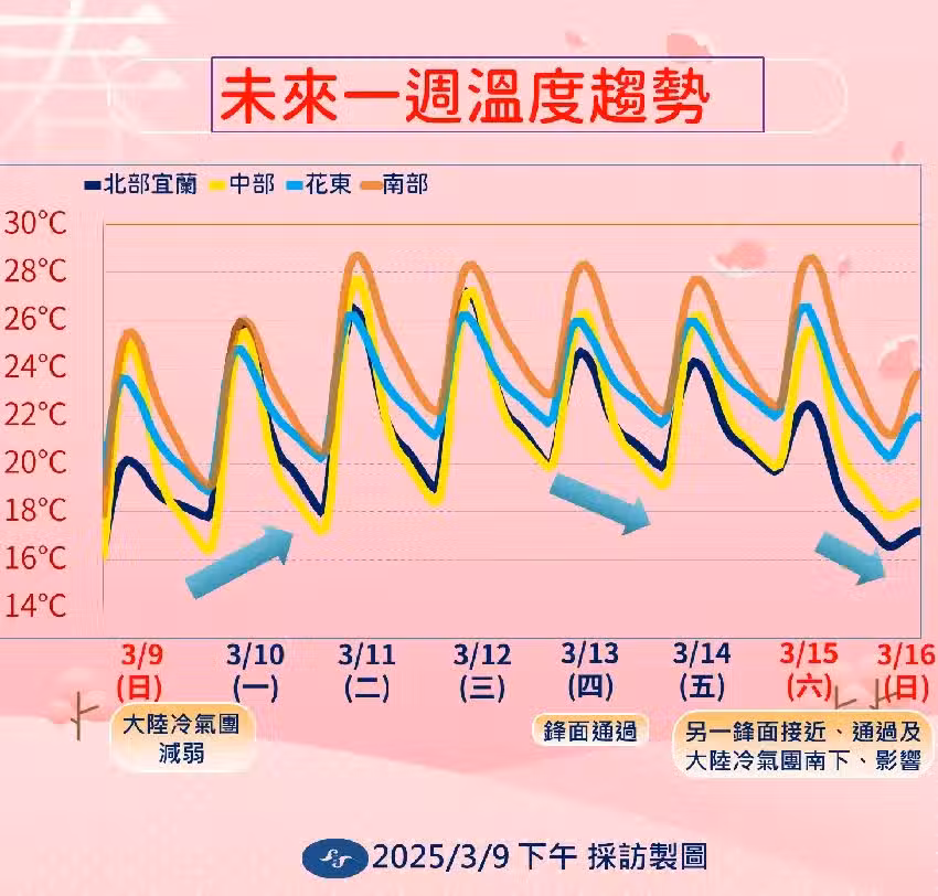 未來天氣變化將分為兩階段,首先是本周四至周六白天,鋒面將在北部海域附近徘徊,雖然氣溫略降但仍維持偏暖。
