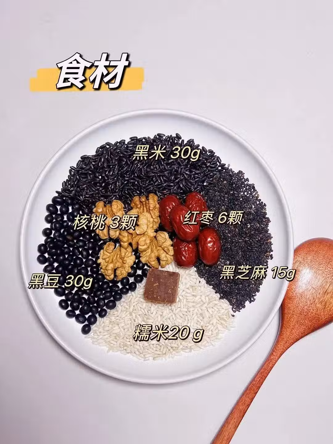 以黑養黑,都是黑色食材,另外加入了核桃仁,對頭髮非常友好!每周安排一兩次,堅持一段時間,感覺氣色也變好了!