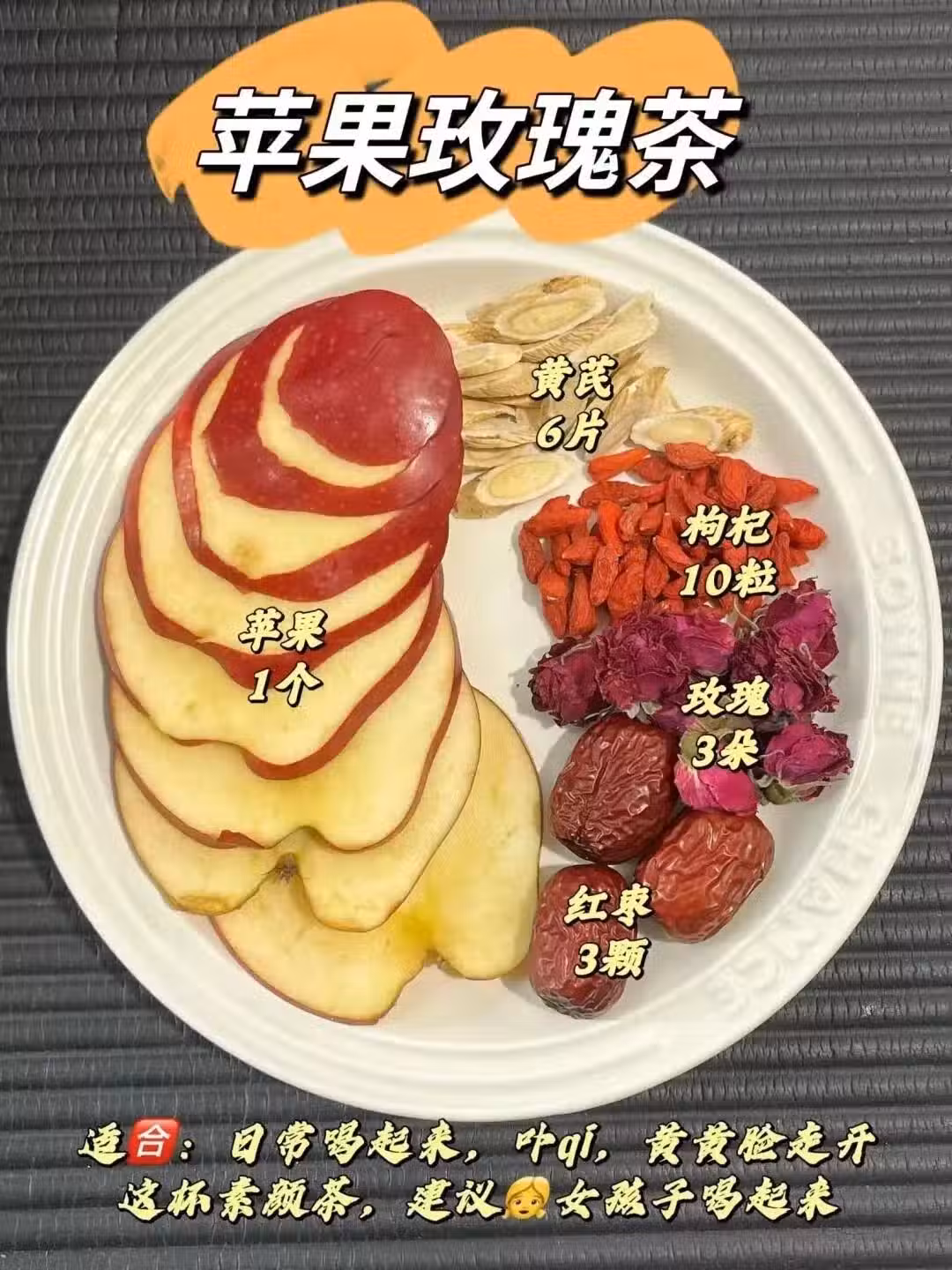 蘋果1個+桑葚干8顆+枸杞10粒+玫瑰3朵+黃芪6片