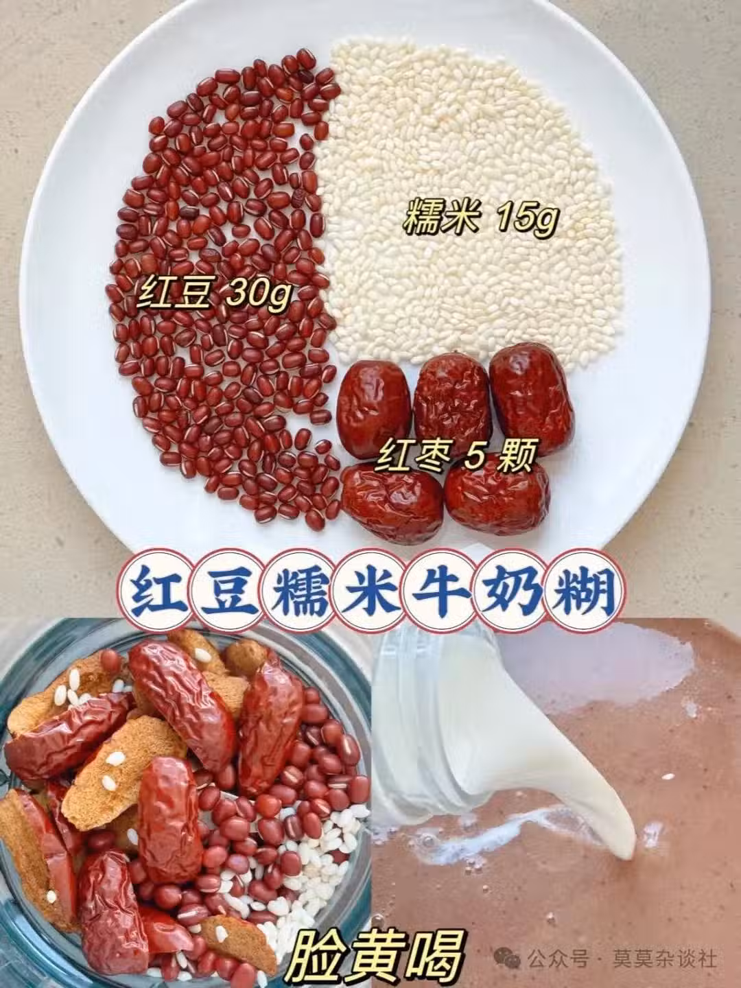 食材: 紅豆 30g | 糯米 15g | 紅棗 5 顆 | 水 300ml | 純牛奶 200ml