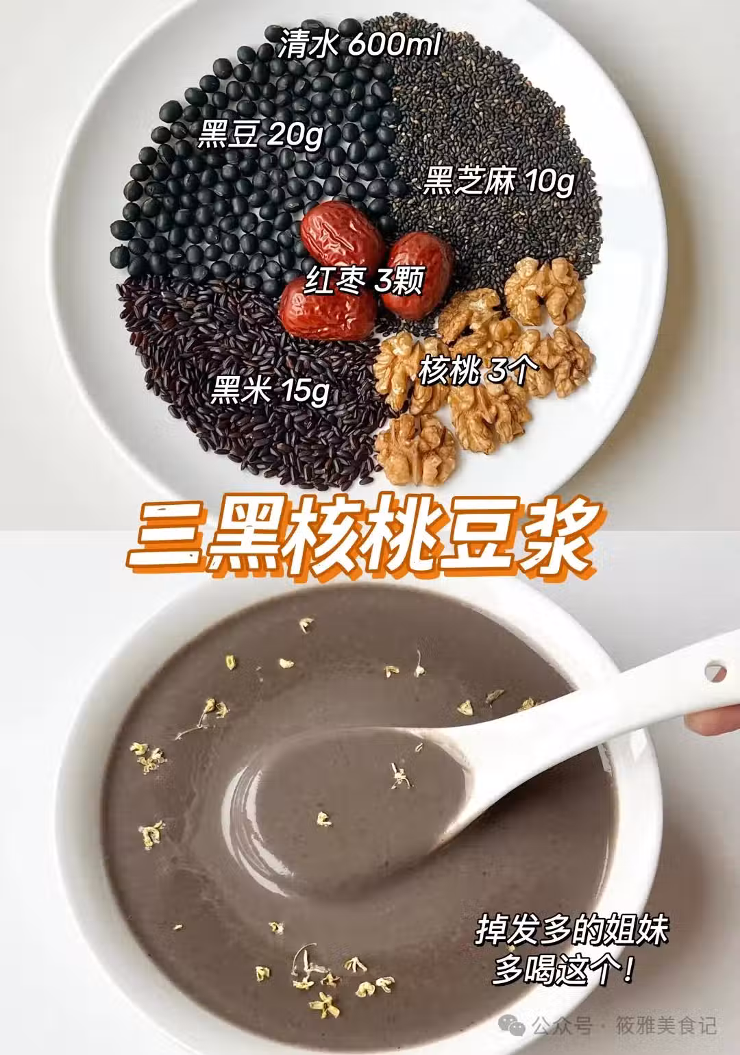 黑豆、黑米、黑芝麻加上核桃,滿滿的都是對身體有益的營養成分。喝上一杯,感覺身體都充滿了能量,頭髮也會更烏黑亮麗吧!