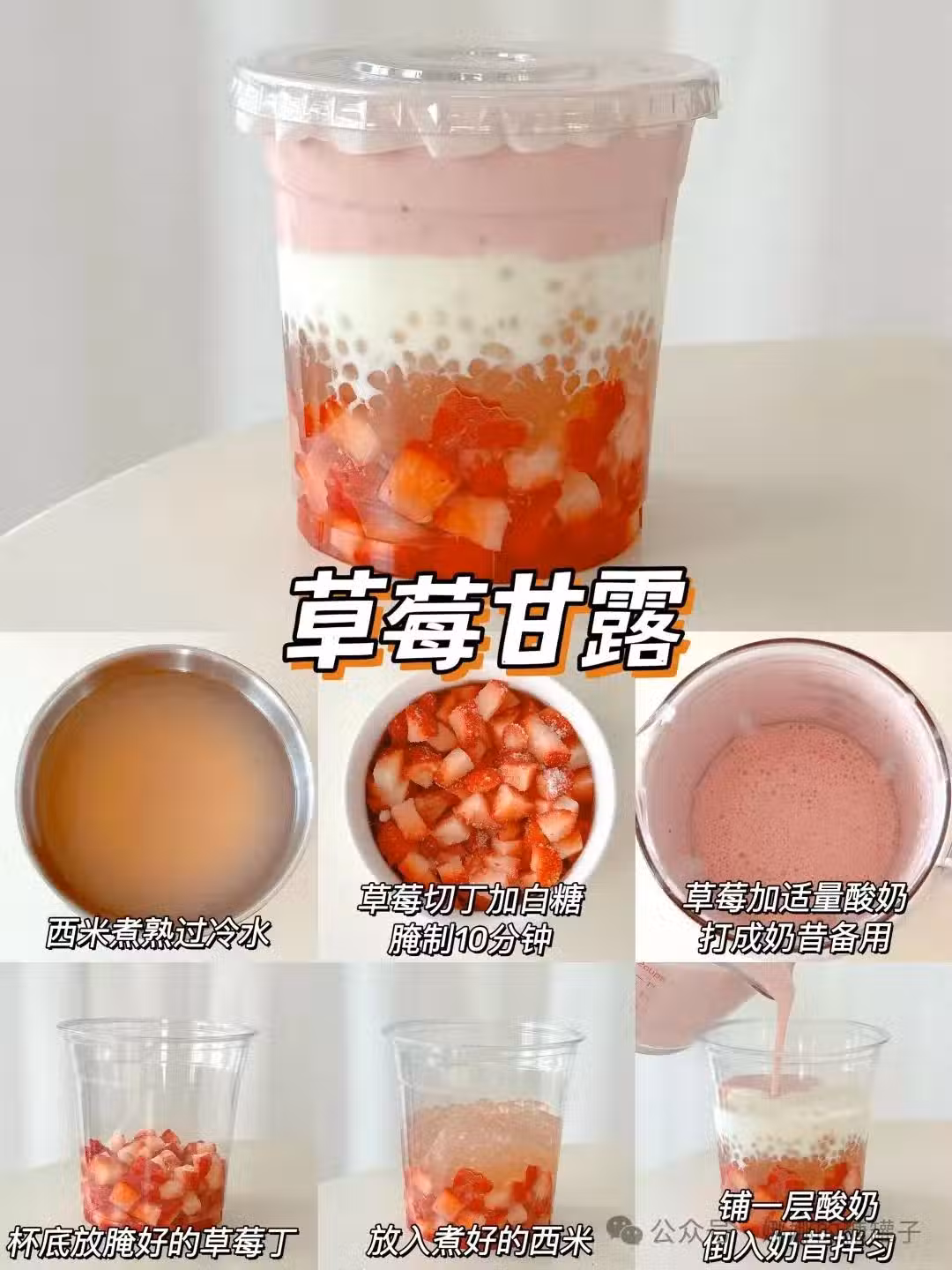 做法:1.西米煮熟過冷水。2.草莓切丁加白糖,腌制10分鐘。3.草莓加適量酸奶,打成奶昔備用。4.杯底放腌好的草莓丁。5.放入煮好的西米。6.鋪一層酸奶,倒入奶昔拌勻。