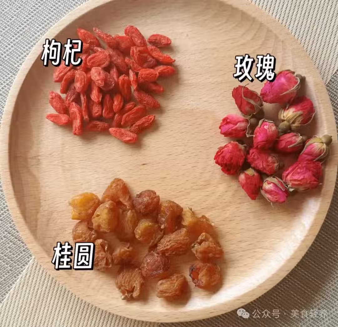 小貼士:玫瑰可以理氣活血,桂圓養血安神、枸杞清肝補血,搭配在一起可以養血活血,疏肝解郁。