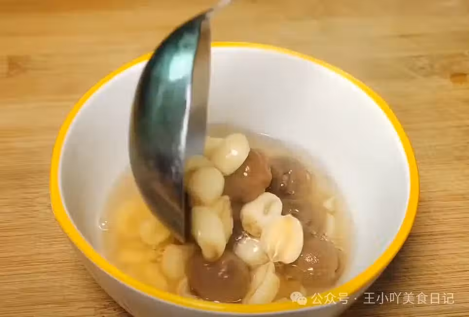 6、享用湯品:燉煮完畢後,將湯品稍微放涼一會,以免燙傷。然後,用勺子將湯品盛入碗中,即可享用。此時的湯品清甜可口,帶有濃郁的桂圓和蓮子的香氣,不僅口感極佳,還能滋補身體、改善睡眠。 食用建議:對於經常失眠、睡眠質量差的人來說,這道蓮子桂圓湯非常適合作為日常滋補品。建議每隔三五天食用一次,以達到最佳的滋補效果。同時,由於桂圓乾具有溫補的特性,所以體質偏熱或上火的人群應適量食用。