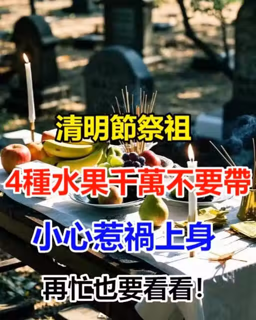 2025 年 4 月 4 日)是清明節,這一天是慎終追遠、祭拜祖先的重要時刻。 然而,祭祖供品有許多禁忌,其中「水果」的選擇尤其重要,若帶錯水果,可能會影響祖先安寧,甚至讓家運受損!這 4 種水果因為寓意不吉,或與傳統習俗相衝,千萬不要在清明祭祖時供奉,以免觸犯禁忌,影響家人運勢!再忙也要看看!這些水果別帶上祭壇,以免影響祖先庇佑,讓家運衰退!
