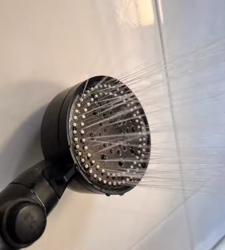 準備一個塑料袋,分別倒入白醋和水(1:1),接著把噴頭拆下來泡進去,差不多3~5個小時後,拿出來用牙膏刷一刷就能解決問題了。