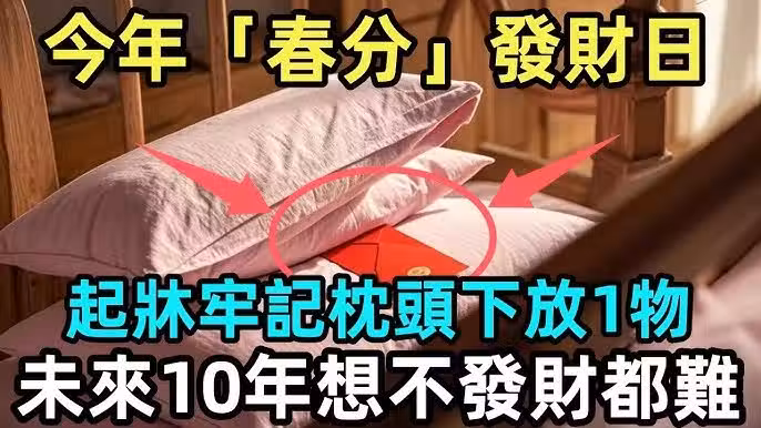 在「春分」這一天,起床前,將紅包袋內放入 1 枚銅錢(或硬幣),然後放在枕頭下,這樣可以吸引「天地財氣」,讓你的財運在未來10年都源源不絕!