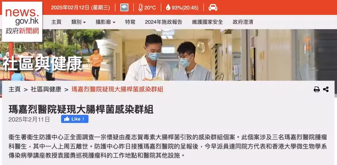 香港特區政府發布新聞公報,特區政府衛生署衛生防護中心懷疑由產志賀毒素大腸桿菌引致的感染群組個案