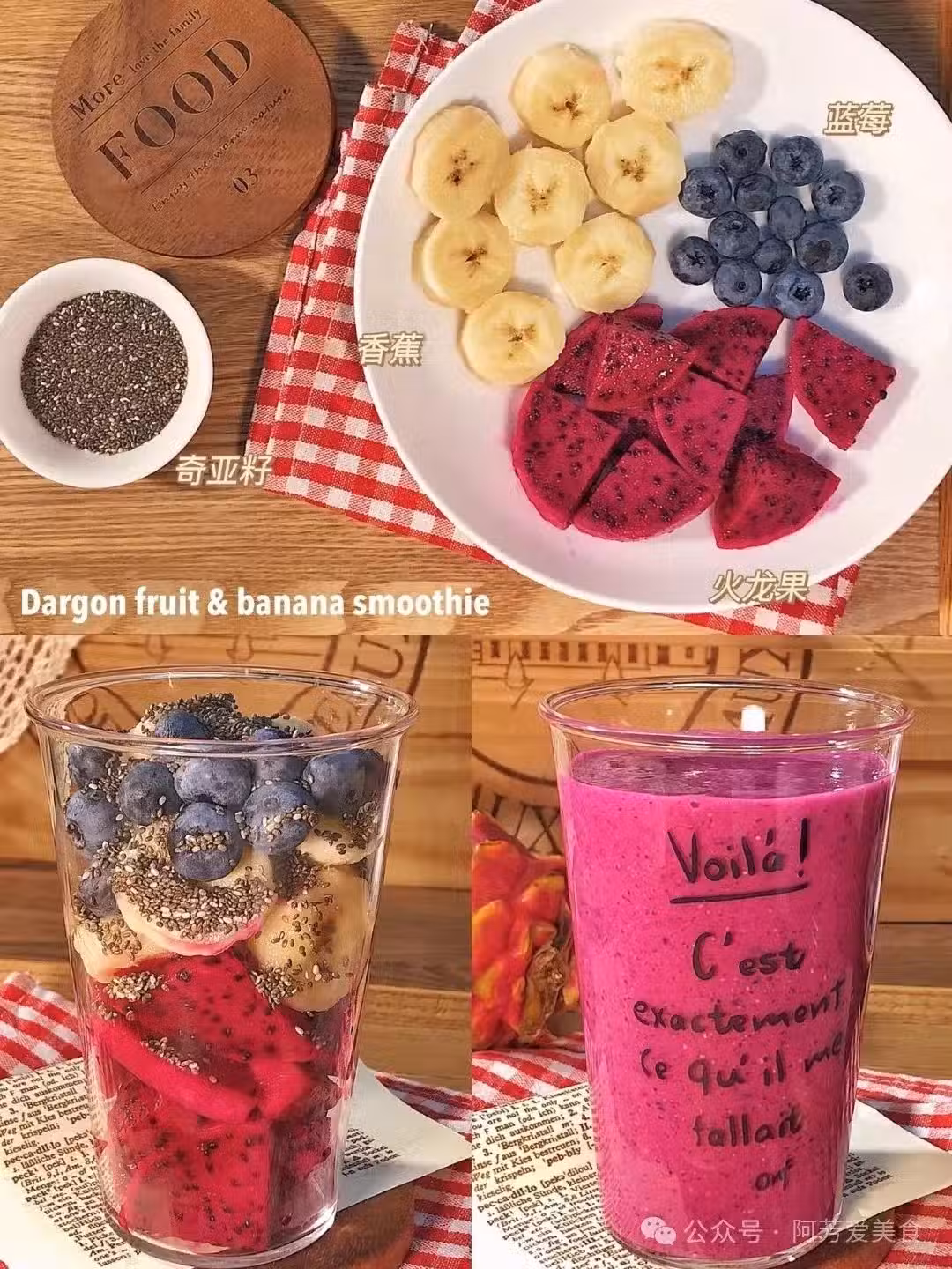 火龍果加藍莓香蕉,還有奇亞籽,這款的口味很豐富,藍莓的香甜融合香蕉的軟糯,還有火龍果的清甜,不僅好喝,還很有營養。