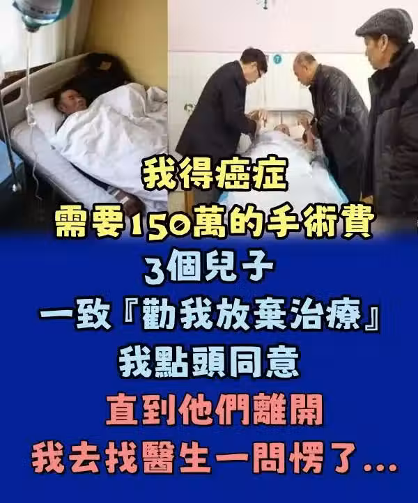 我得了癌症需要150萬的手術費 3個兒子一致『勸我放棄治療』我點頭同意 直到他們離開我去找醫生一問愣了...