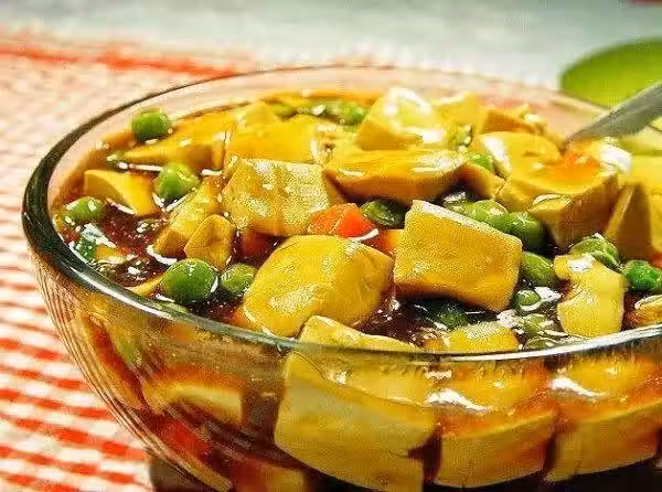 食材:豆腐一塊半、豌豆、胡蘿蔔丁少許。