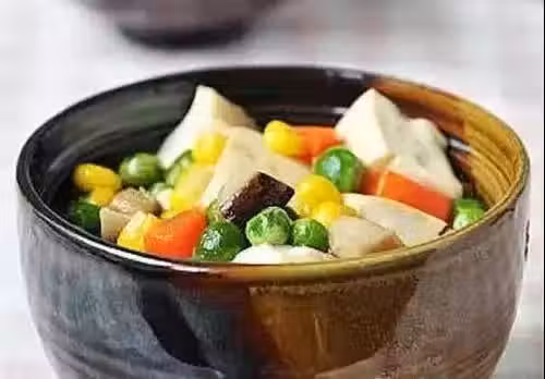食材:韌豆腐、甜玉米、甜豌豆、干香菇、胡蘿蔔、油、鹽、生抽、澱粉、香油。