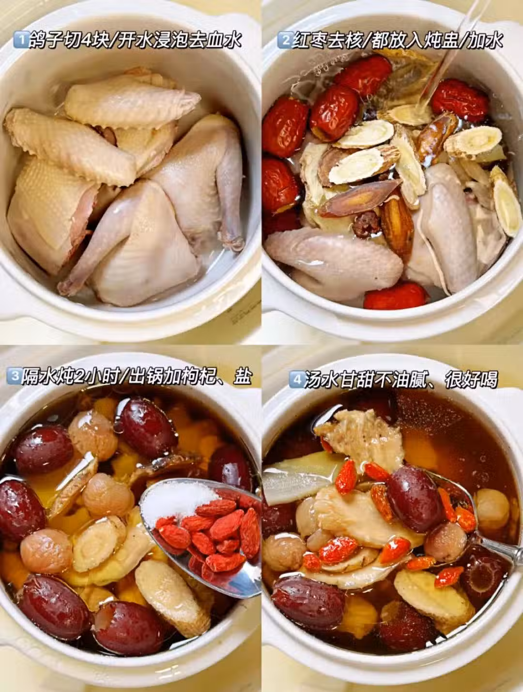 1.鴿子切開泡去血水,也可以進行焯水處理,紅棗去核效果會好一點;