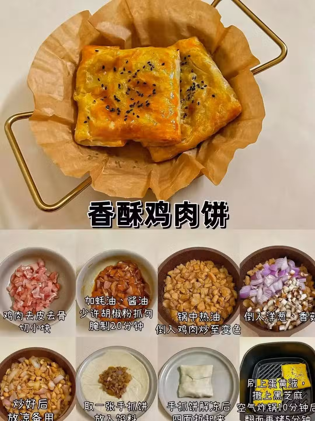 1.香酥雞肉餅:北京胡同里的「叛逆小吃」 你以為雞肉餅都是軟趴趴?這款偏要酥到掉渣!靈感來自老北京門釘肉餅,但咱直接用手抓餅當外皮,塞滿雞胸肉+洋蔥碎,煎到金黃酥脆,咬一口能聽見「咔嚓」聲,肉汁直接飆到嗓子眼。 小孩吃?建議多做倆,不然可能引發家庭大戰。