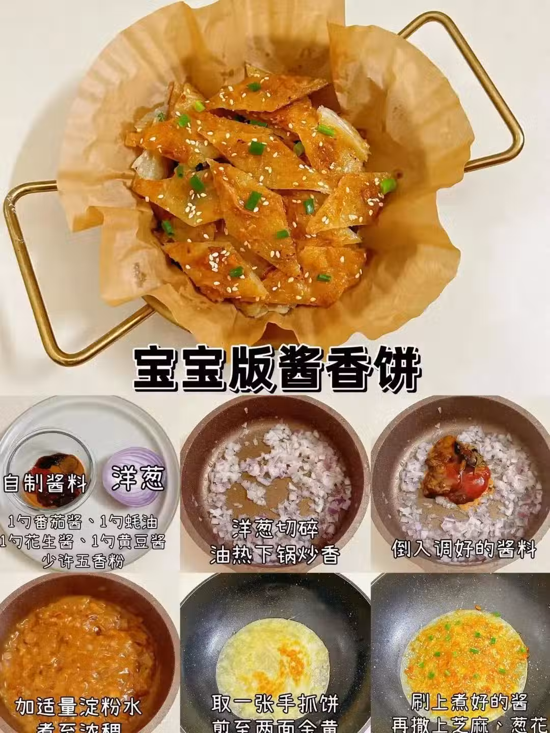 9. 寶寶版醬香餅:路邊攤的健康替身 普通手抓餅刷一層自調醬(豆瓣醬+番茄醬+糖),出鍋撒蔥花,切塊後秒變「兒童米其林」。 娃若質疑:「這和校門口的不一樣!」請淡定回答:「這是媽見喜版。」