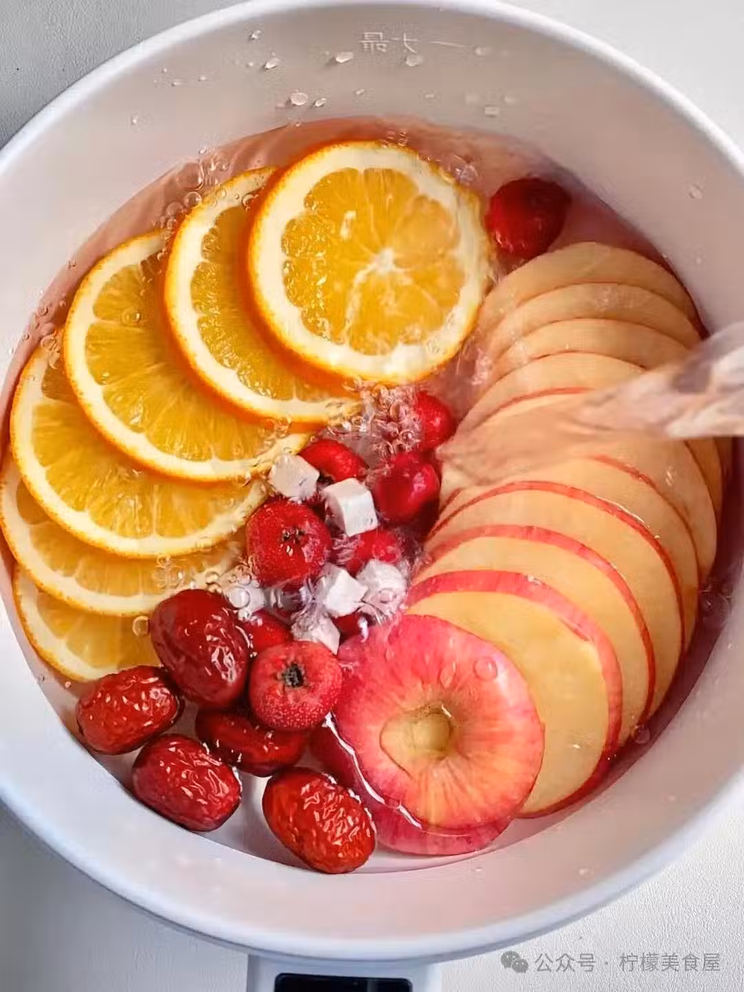 這幾天,天氣熱熱的,不少人都穿起了短袖,奶茶冷飲可能都安排上了。 為了健康著想,還是多喝養生水比較好,比如蘋果水、桂圓水、桑葚水等等。 蘋果水我分享過好幾次了,今天再給大家分享4款蘋果水,做法簡單,功效多多,愛養生的小夥伴,一起來學習學習吧。 一、蘋果橙子山楂水 橙子特別適合煮水果茶,橙子維C之王,美容養顏、增強抵抗力、健胃消食。山楂大家也都知道吧,消積食、開胃。茯苓健脾養胃、提高免疫力。 蘋果和這三樣食材煮在一起,再加紅棗,可是一款特別好的蘋果水,經常熬夜、喜歡吃大魚大肉的姐妹一定要試試! 酸酸甜甜,清爽解膩,偷偷告訴大家,煮過的果肉也可以吃哦,膳食纖維滿滿,有利於腸道健康。 食材: 茯苓、山楂、橙子、紅棗、蘋果 做法: 1、蘋果用鹽搓洗乾淨,去核切塊。山楂清洗乾淨,橙子切片。茯苓泡水清洗乾淨。 2、所有食材放到鍋里,加適量清水,煮20分鐘即可。