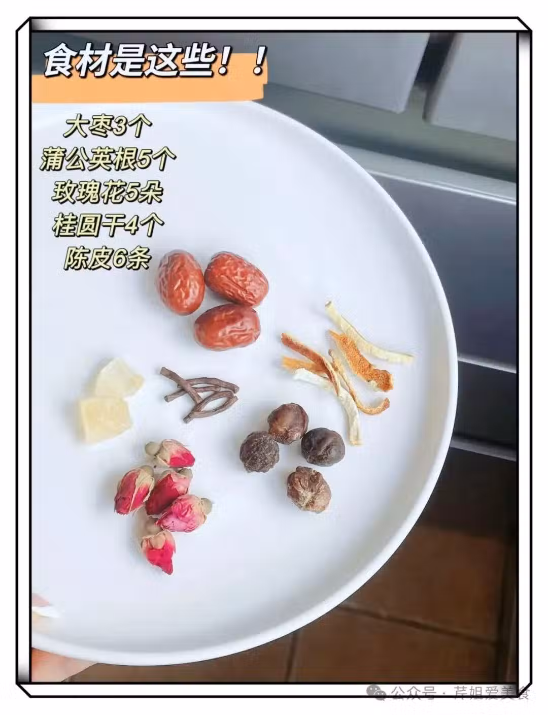 🌟準備紅棗3個、蒲公英根5個、玫瑰花5朵、桂圓乾4個、陳皮6條,再加入適量的黃糖。將這些材料放入500ml的水中,用迷你養生壺選擇燒水模式煮開就行。如果懶得煮,也可以用開水泡,多燜一會兒就好。