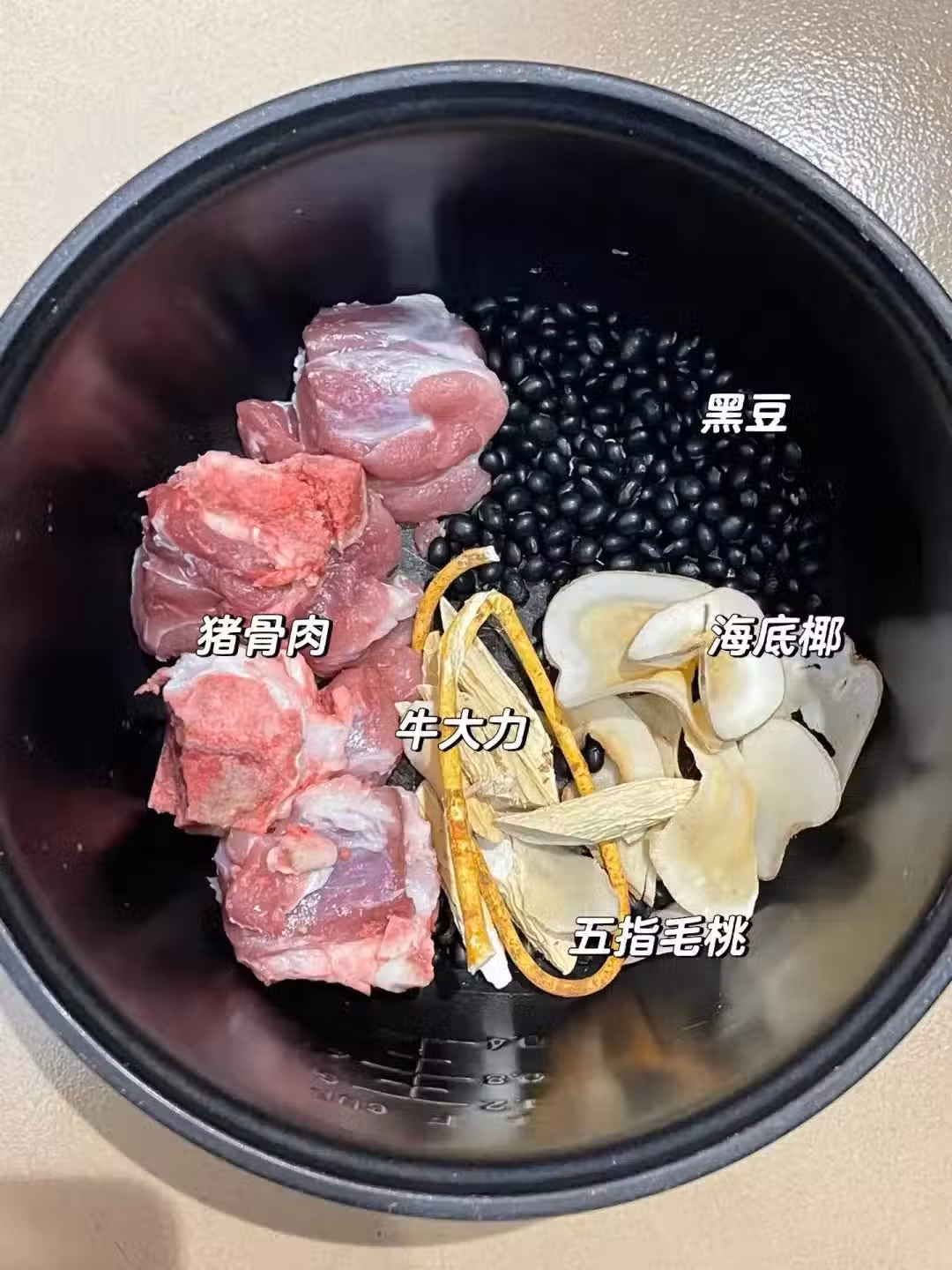 - 將處理好的豬骨、黑豆、海底椰、牛大力、五指毛桃放入湯鍋中,加入適量的清水,一般為2000 - 3000毫升左右,具體可根據食材的量和個人喜好調整。