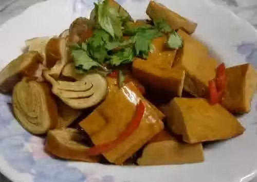 材料: 豆乾 400 克 素雞 300 克 醬油 3 大匙 糖 1 大匙 辣椒 1 條 八角 3 粒 花椒粒 1 小匙 薑絲 4 片 油 10 克 水 400 克 做法: 1.熱鍋爆香薑片、辣椒、八角、花椒粒,再加入醬油、糖爆出醬香味,再加入水煮沸。 2.加入豆乾、素雞,轉中小火慢鹵,中間翻轉食材,使其均勻入味。鹵至食材入味,汁快收干即可熄火。 3.將素雞切片,和豆乾一起裝盤即可上桌,趁熱享用。