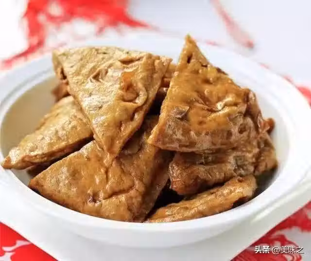 豆腐乾1000g、植物油1000g、鹽2茶勺、八角1個、桂皮5g、陳皮1小塊、丁香3g、花椒粒10個、小茴香2g、香葉1片、良姜半塊、草果1個、甘草1片、干紅辣椒1個、姜1塊、蔥1段、味精3g、冰糖30g、老抽1湯勺、老滷汁適量。