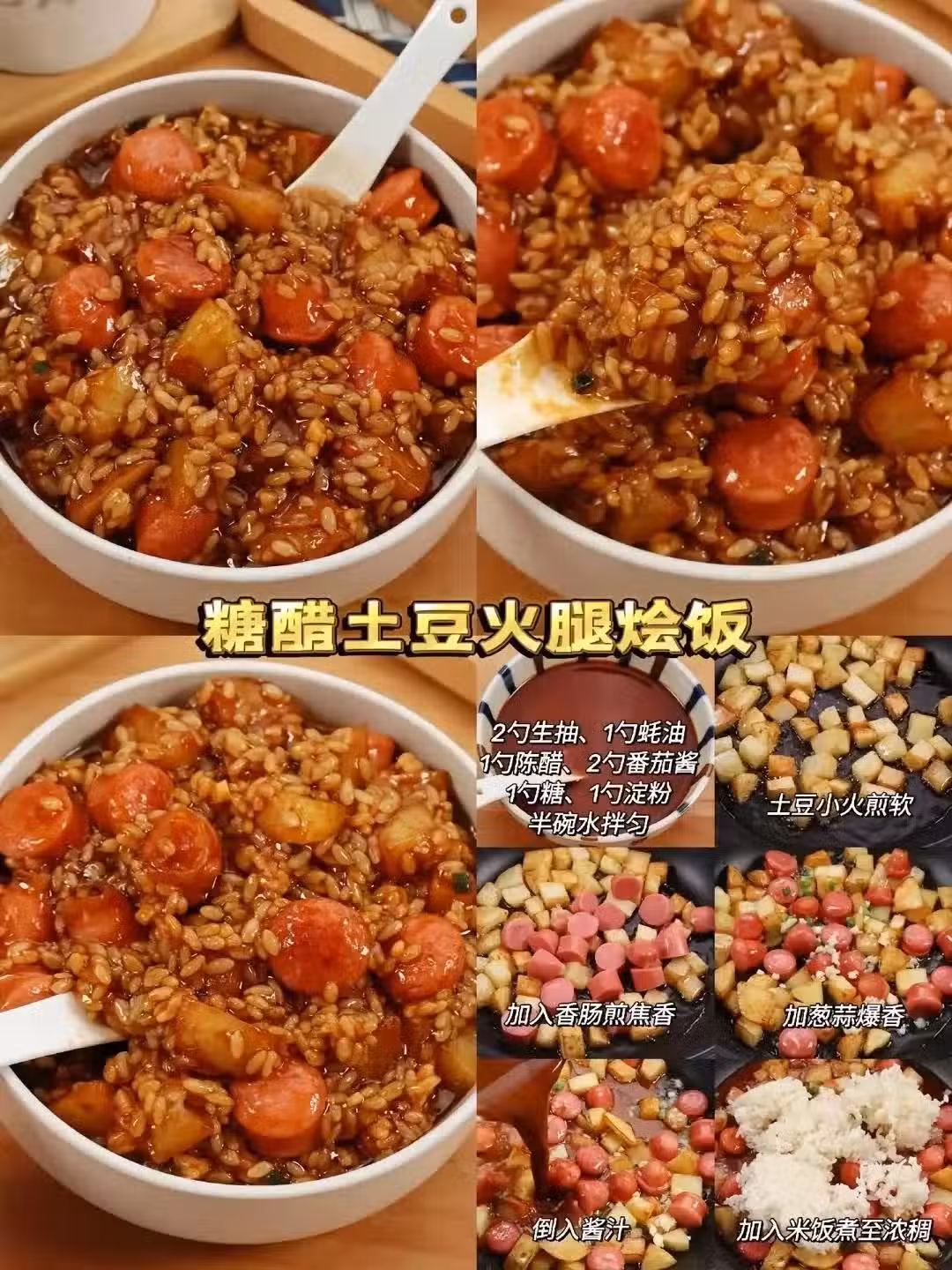 大學食堂之光重現江湖。土豆火腿丁炒軟,倒糖醋汁(1糖1醋2醬油)燜熟,扣在米飯上瞬間夢回宿舍偷用電煮鍋的青春。