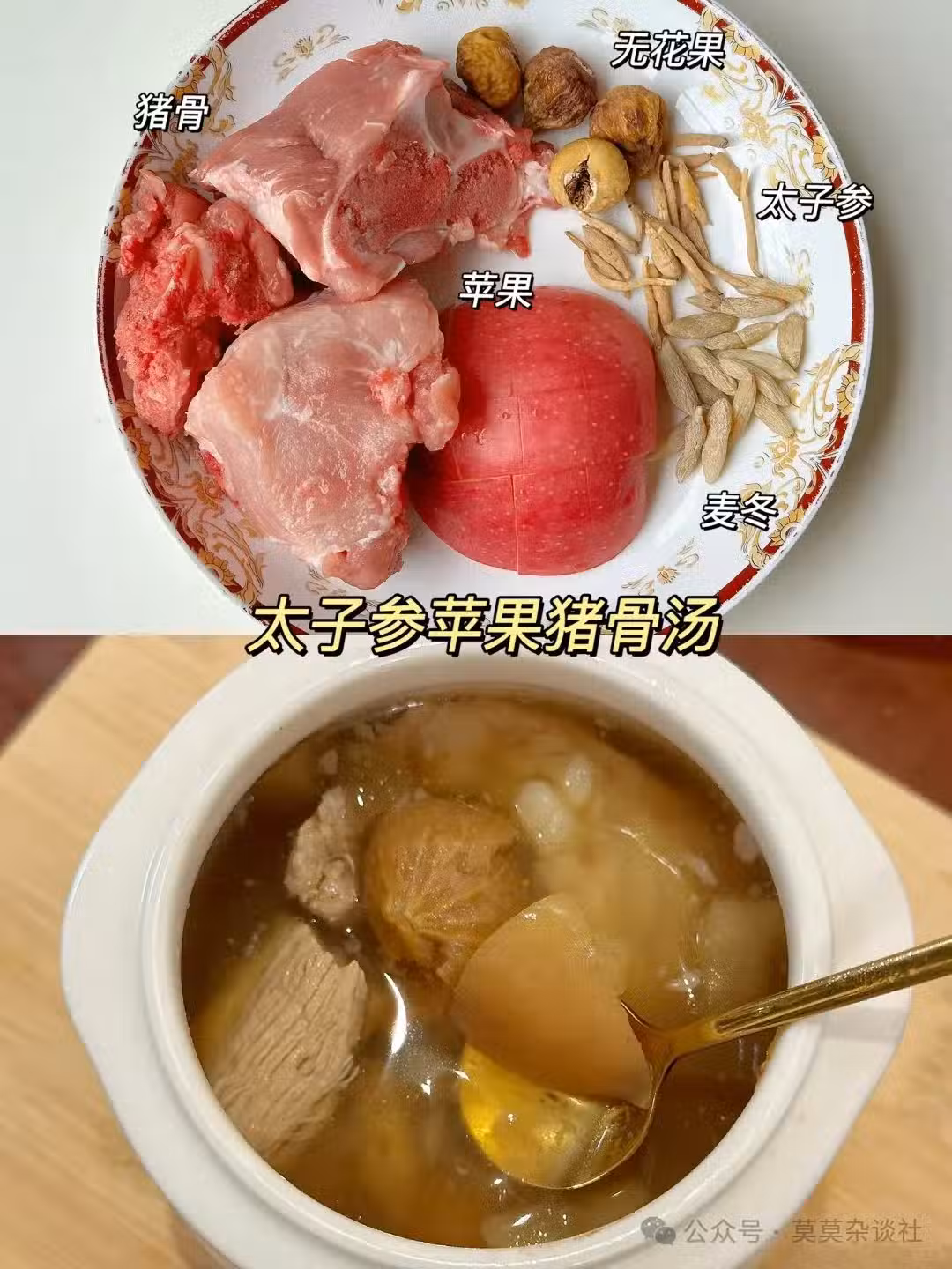 做法: 太子參提前泡發;蘋果去核切塊(保留果皮更香);豬骨焯水。全部食材燉煮1.5小時,最後加鹽調味。