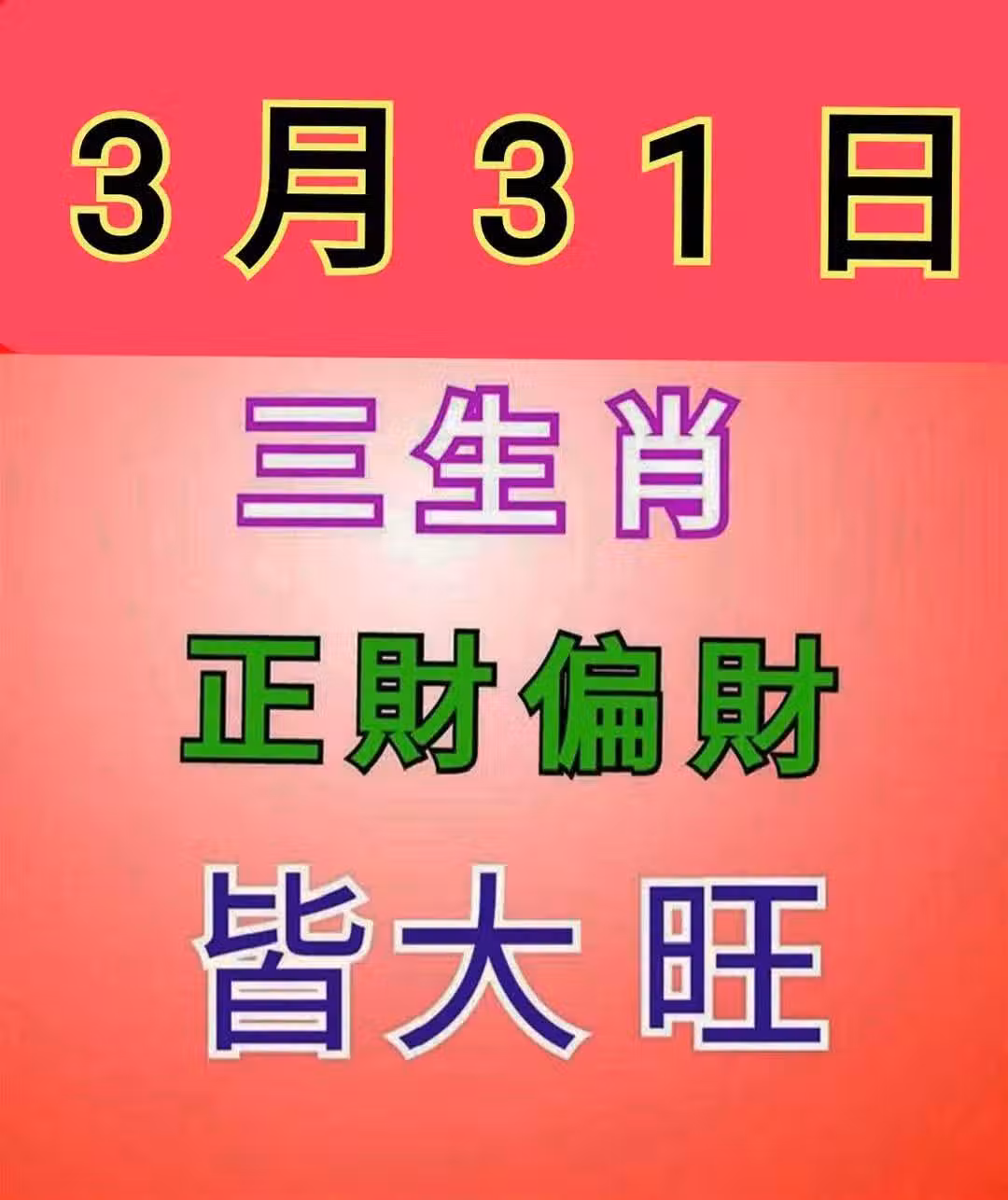 3月31日 三生肖 正財偏財「 皆大旺 」