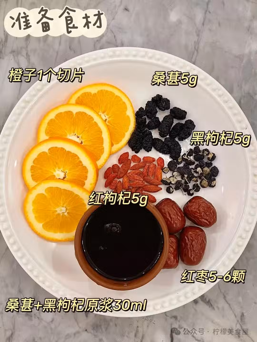 做法: 1、桑葚、黑枸杞、紅枸杞、紅棗放到杯里,加熱水,泡洗一篇,橙子用鹽搓洗乾淨,切片。 2、紅棗、紅枸杞、黑枸杞放到鍋里,加500ml清水,開中火至水煮開。 3、煮開後倒入橙子,轉小火煮5分鐘,關火後可倒入30ml桑葚,黑枸杞原漿攪拌均勻。