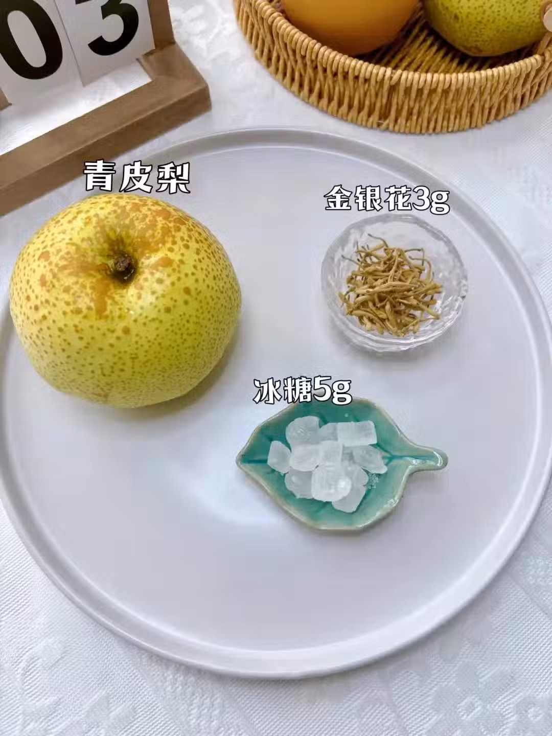 雪梨切開挖掉果肉,把冰糖和金銀花放進去,加適量水,蓋上蓋子上鍋蒸20分鐘左右就可以了!