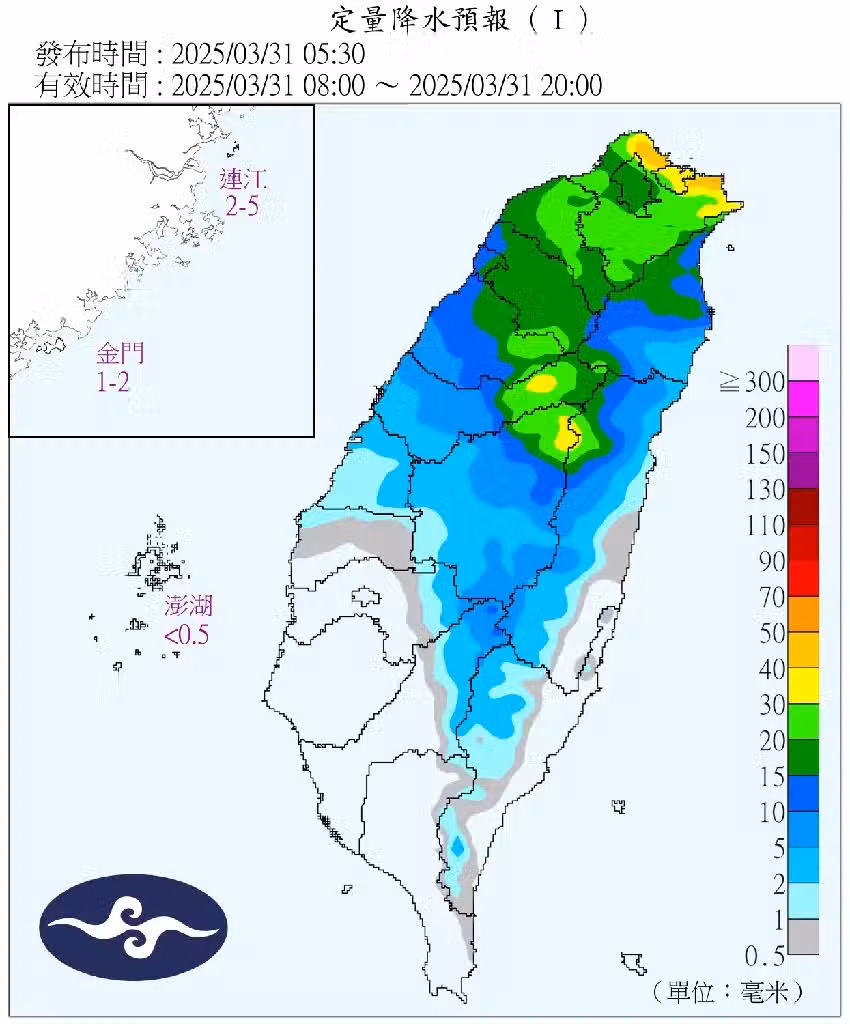 此外,中央氣象署也發布「陸上強風特報」,東北風明顯偏強,今 (31) 晨至周二 (1) 晚間,蘭嶼、綠島、新北市、桃園市、新竹市、新竹縣、苗栗縣、台中市、彰化縣、雲林縣、嘉義縣、台南市、高雄市、屏東縣、澎湖縣、金門縣、連江縣局部地區有平均風6級以上,或陣風8級以上發生的機率。