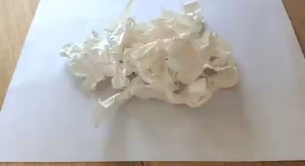 將晾曬好的鳳凰衣放在一張白紙中間,把白紙像包餃子一樣摺疊,用擀麵杖來回輕輕壓一壓,把鳳凰衣壓碎。