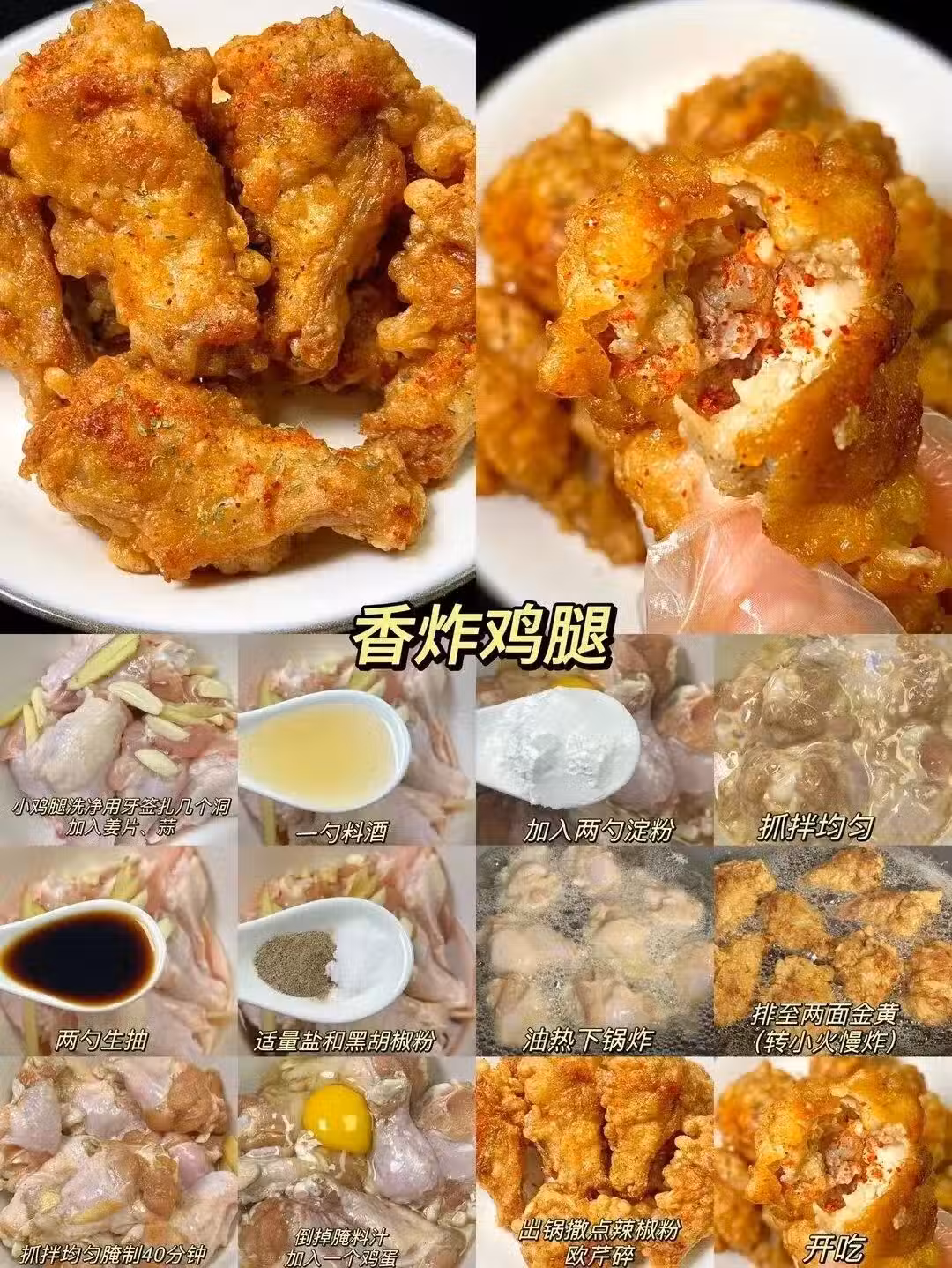 香炸雞腿:健身房出來拐進廚房,雞腿界的內卷冠軍非它莫屬! 雞腿劃刀用蔥姜蒜腌透,裹上蛋液澱粉,炸到表皮像玻璃脆。 咬開瞬間汁水biu出來,隔壁健身教練聞著味兒衝過來:「說好的一起減脂呢?!」(溫馨提示:吃完記得擦嘴,油光鋥亮容易暴露犯罪現場。)