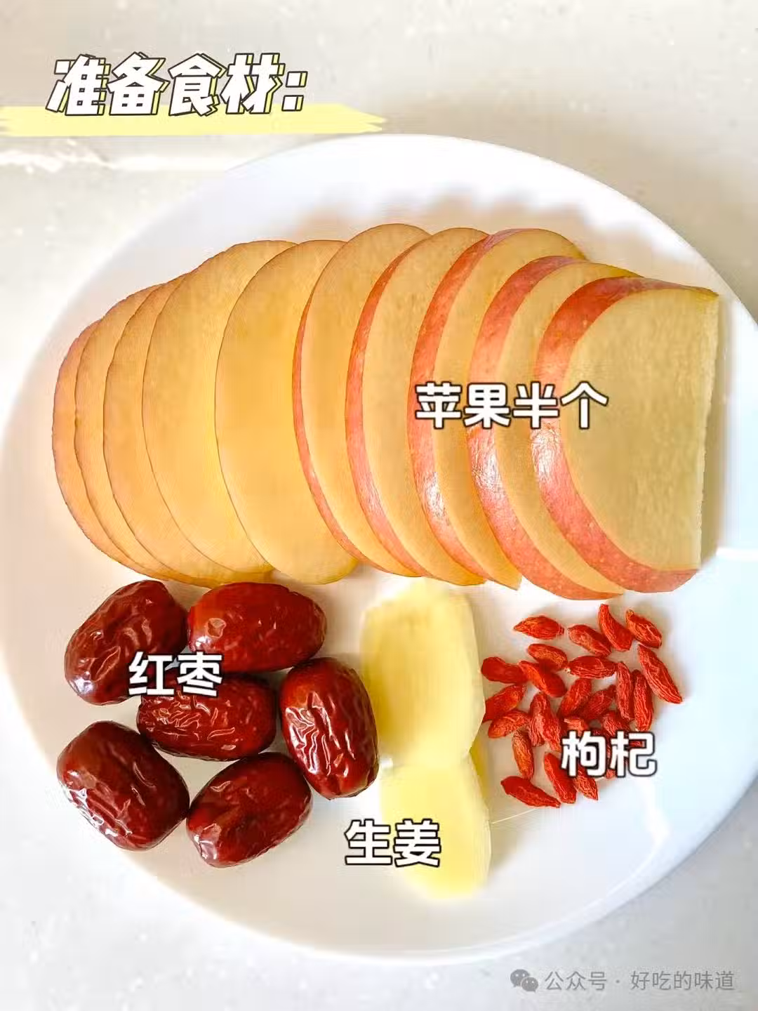【做法步驟】:蘋果洗凈切塊,紅棗去核,與生薑枸杞一同放入鍋中,加水煮沸後轉小火煮20分鐘。