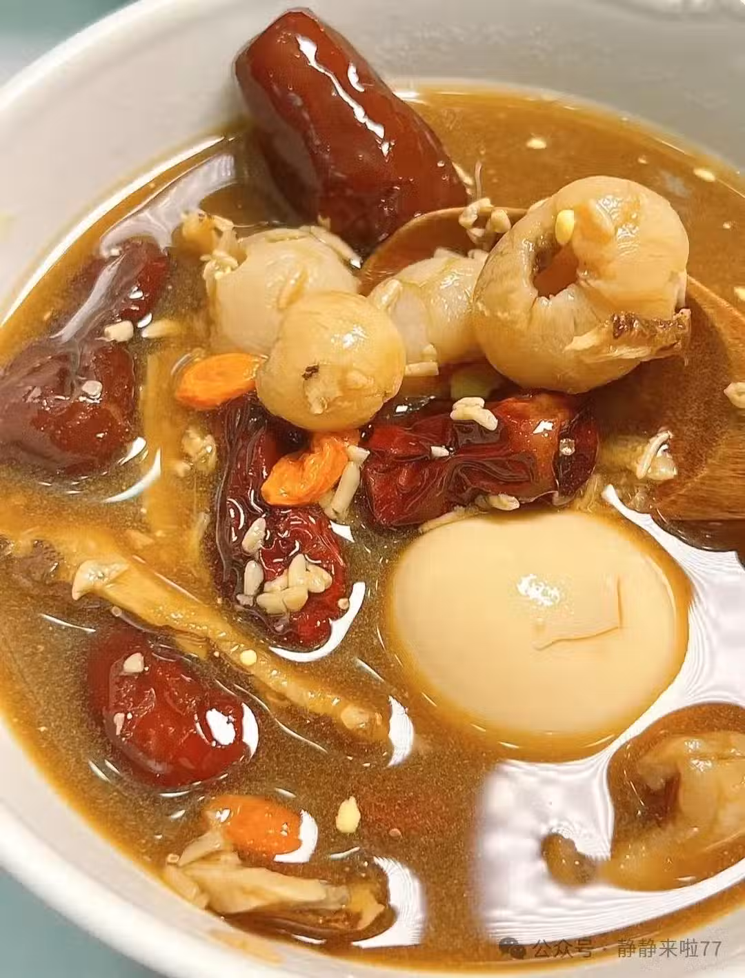 📝食材簡單,都是常見的好物:生雞蛋1 - 2個、黃芪5g、當歸3g、紅棗5顆、桂圓8粒、枸杞一小把、紅糖適量、酒釀兩勺(可不放)。