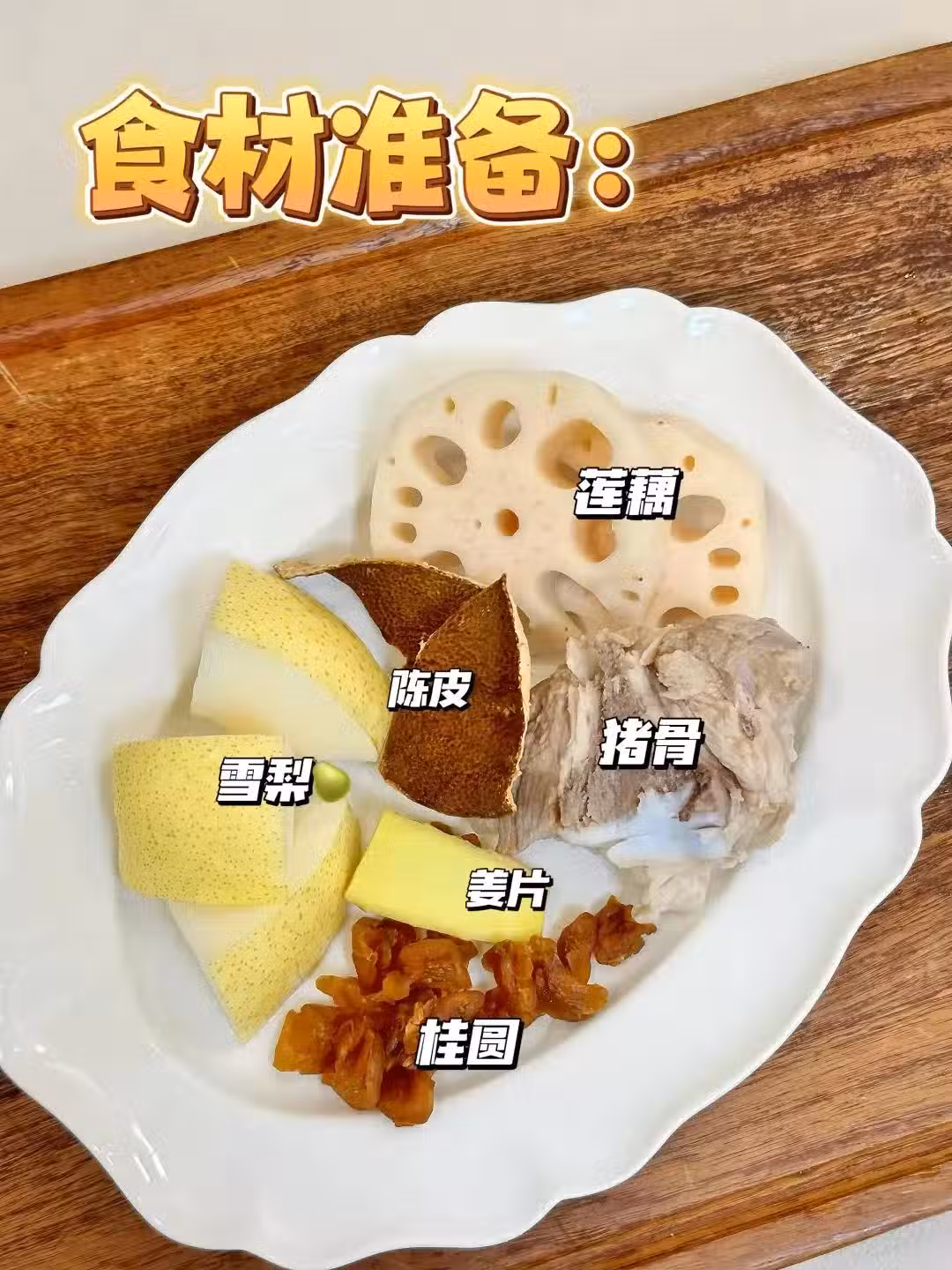 2. 蓮藕去皮洗凈,切成小塊;雪梨去皮去核,切成大塊;桂圓去殼去核;陳皮泡軟,颳去內瓤。