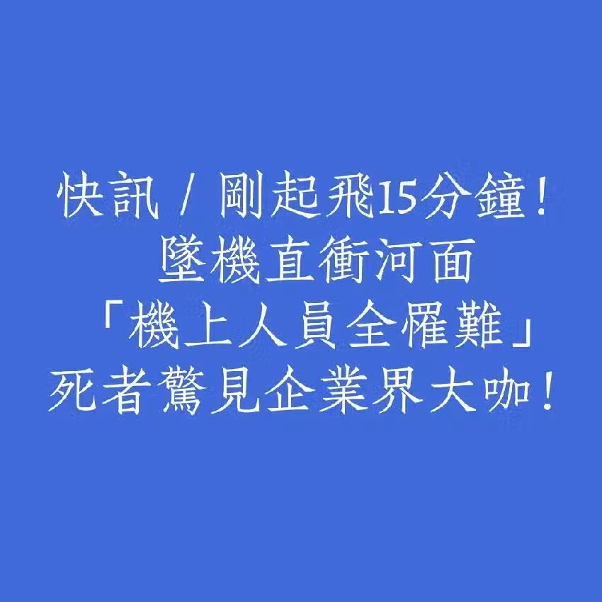 快訊/剛起飛15分鐘!墜機直衝河面「機上人員全罹難」...死者驚見企業界大咖!