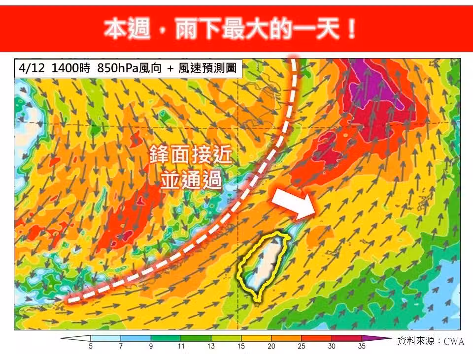 針對鋒面接近、水汽增加,前中央氣象局局長鄭明典透過衛星雲圖分析,雲層呈現紫色區塊代表雲頂高度極高且溫度極低,邊緣色階密集堆疊顯示這是強對流系統的特徵,發生示警:「這是暖季降雨即將到來的預告!」
