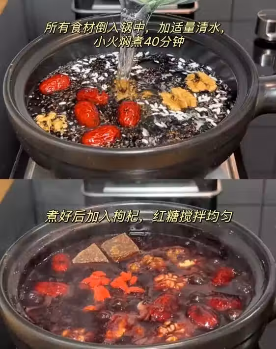 所有食材倒入鍋中,加適量清水,小火燜煮40分鐘,煮好後加入枸杞,紅糖攪拌均勻