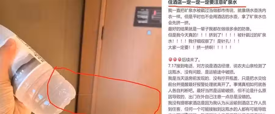 還有更複雜的,有個網友說酒店的礦泉水被扎破了小洞: