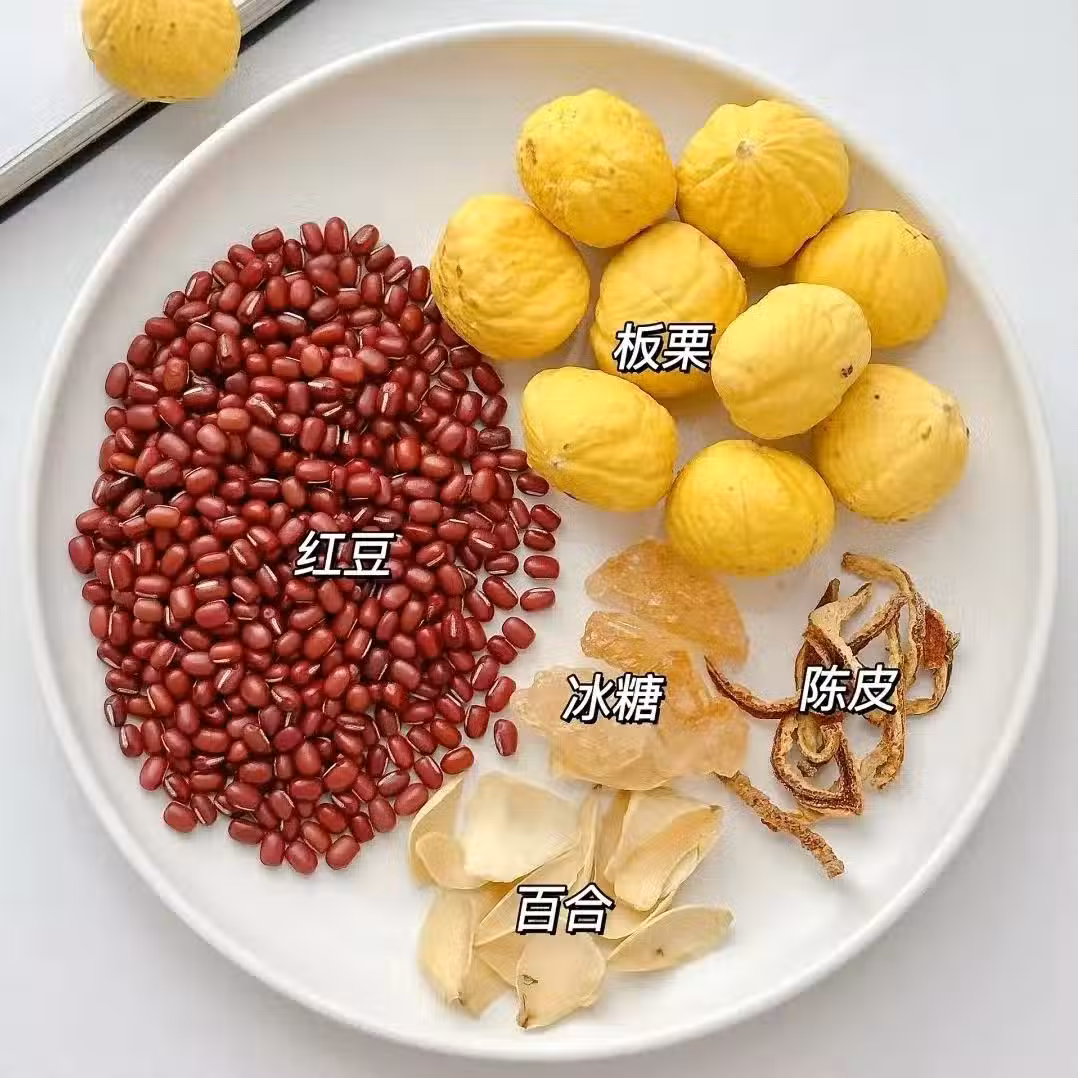 紅豆與板栗相得益彰,一補血一補腎,特別適合腎虛腰酸、睡眠淺易醒的人。晚飯後兩小時飲用,能安神助眠。陳皮少量即可,過多會搶走甜香。