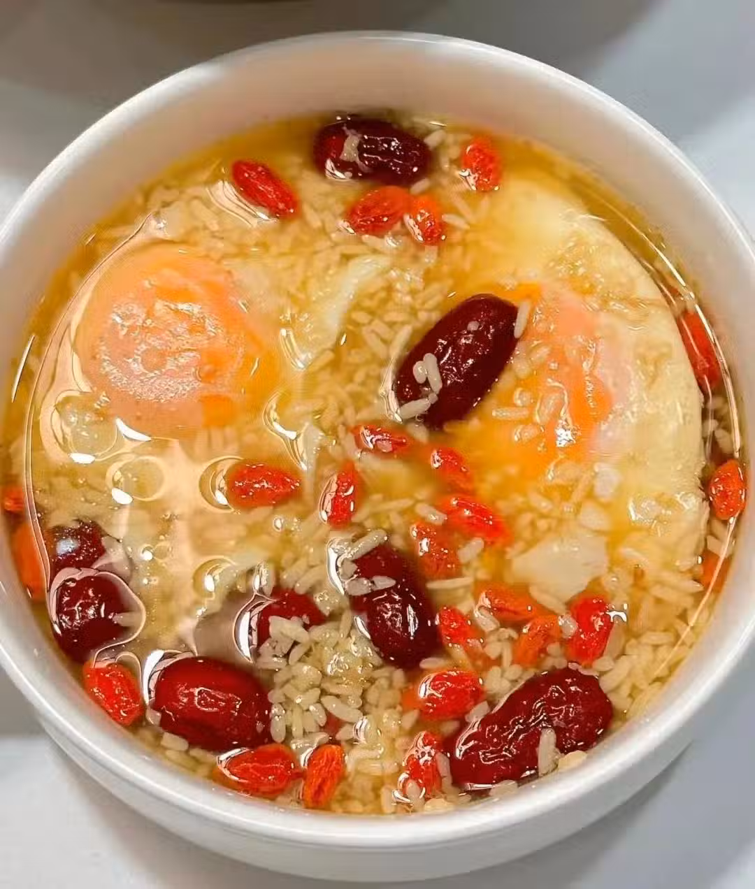 食材:紅糖1塊、酒釀1份、雞蛋2個、枸杞1把、紅棗5顆