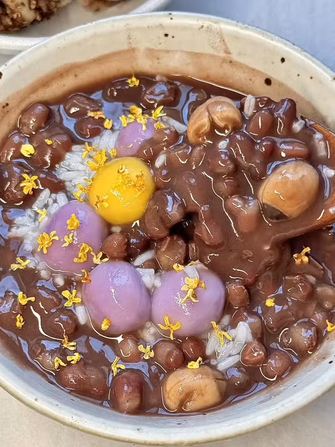 3、加入一勺酒釀,再加入小圓子煮1分鐘左右,撒上桂花點綴即可。
