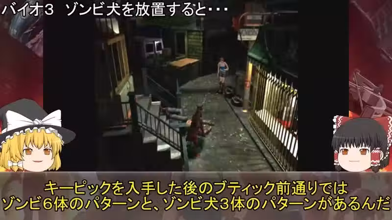 首先就是PS主機上的惡靈古堡3代,在開頭吉兒還未進警局前,在道路上會遇到殭屍犬這樣的怪物,這時如果靜靜著將角色擺著不動,那麼殭屍犬預設動作就會咬地上的屍體,然後慢慢地越咬越上面,如此就成為了一個有趣的錯位畫面