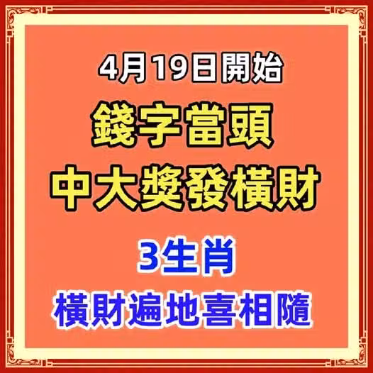 4月19日開始錢字當頭,中大獎發橫財,3生肖橫財遍地喜相隨!
