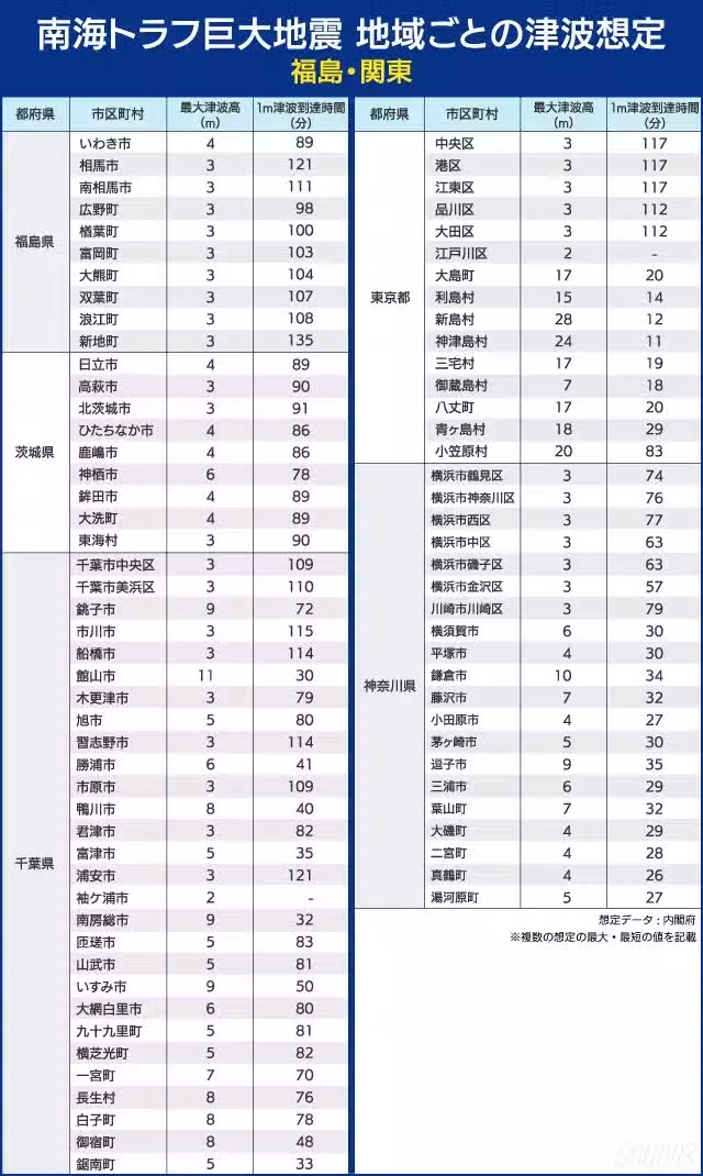 此外,從福島縣到沖繩縣的25個都府縣,預計將受到3米以上海嘯影響;從關東到九州的13個都縣,預計會受到10米以上海嘯影響;高知縣與靜岡縣部分地區,恐受到逾30米巨大海嘯影響,水深30公分以上的淹水區域,比一次估算增加3成,達11萬5150公頃。